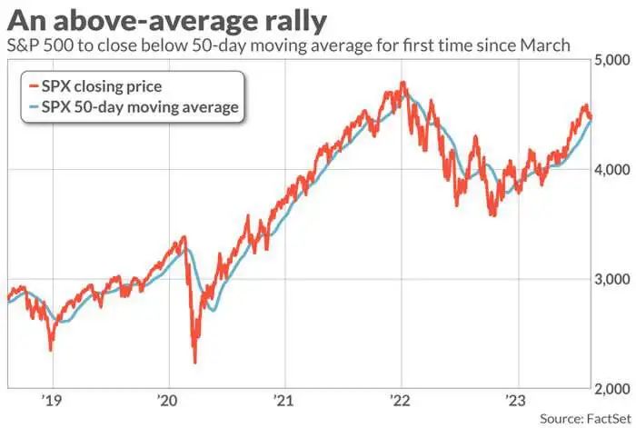 根据道琼斯市场数据(Dow Jones Market Data),这也标志着标普500指数自3月28日以来首次收于50日移动均线下方,结束了连续96天收于50日移动均线上方的行情。标普500指数上一次连续收于50日移动均线上方持续了102天,于2020年9月17日结束。