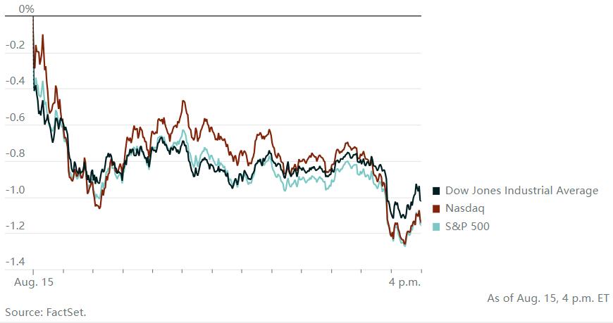 受美债收益率上升、美国零售数据超出预期和中国经济数据疲软的影响,美股市场周二(8月15日)全线下跌。道指下跌361点,结束了连续三个交易日的上涨,跌幅1%;标普500指数收跌1.2%,纳指收跌1.1%。