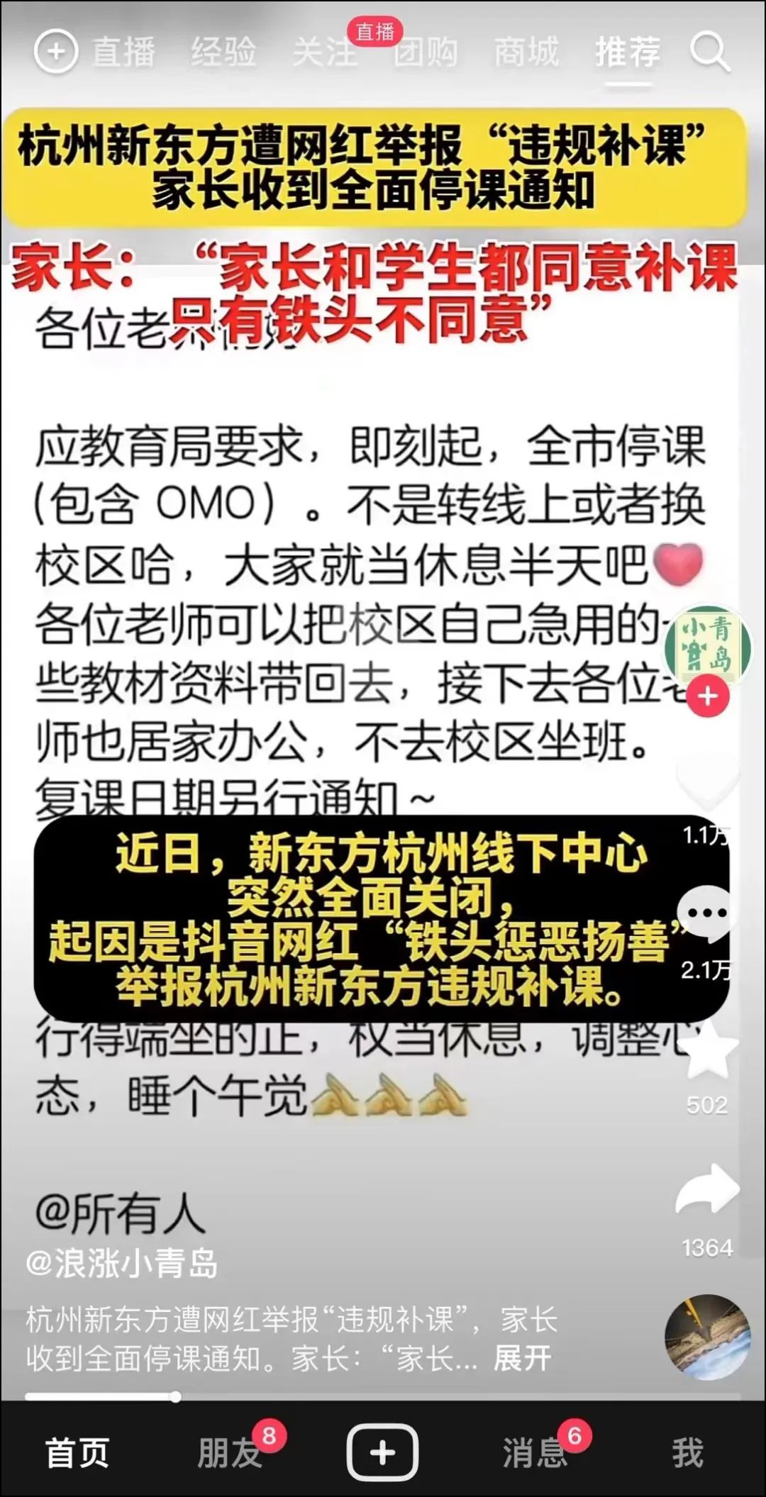 视频末尾,这家新东方机构暂停营业。而在此之后,铁头陆续发布了4条举报违规补课的视频。这也导致事情持续发酵,新东方也受到影响宣布杭州全面停课。