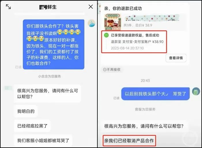 “我们目前已经把‘铁头’拉进黑名单了,绝对不会再找他带货。如果您是针对‘铁头’不满意,我们已经做出相应的措施了。同时也希望您能理解,给我们一次机会。”某商家发布声明称。