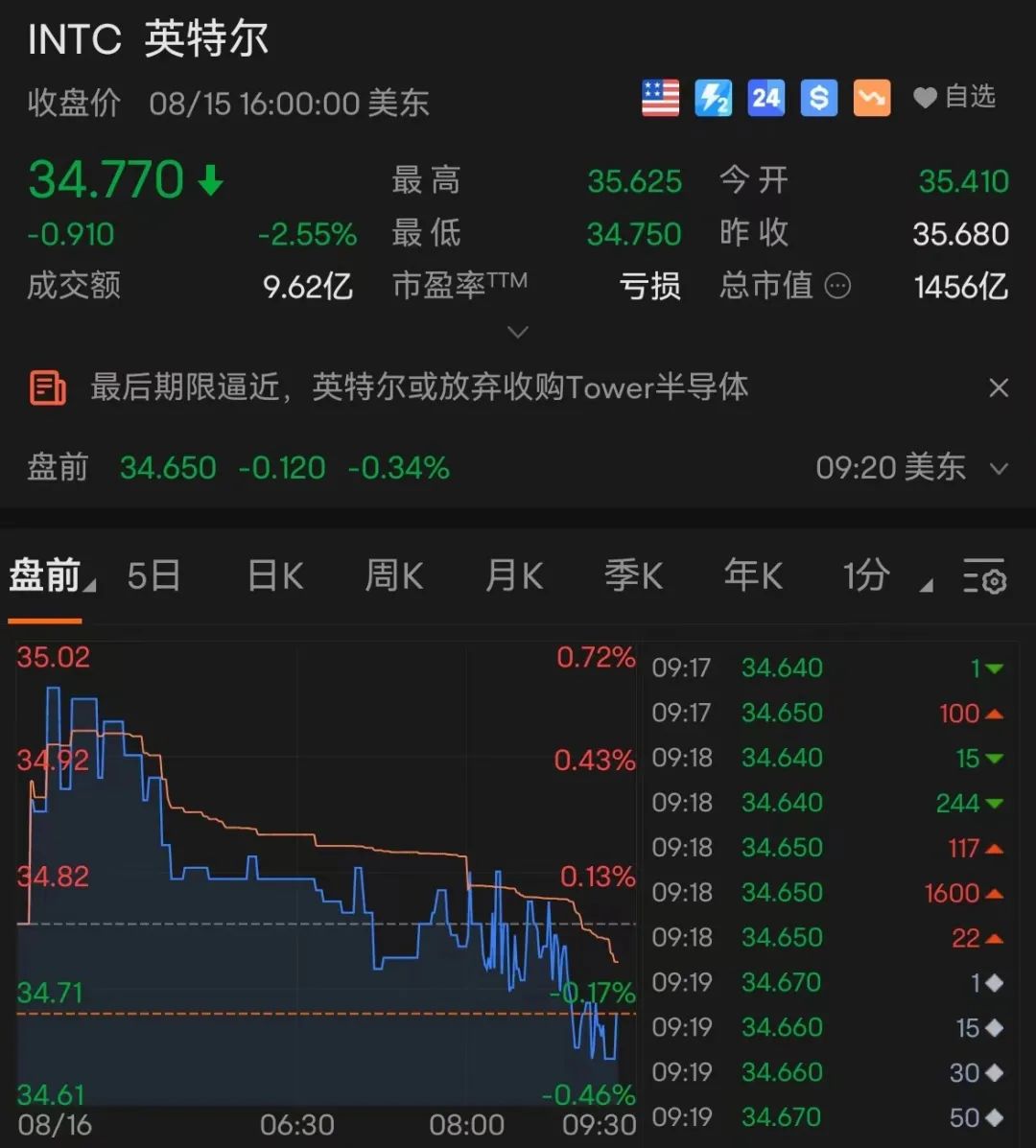 因此,虽然收购高塔失败,英特尔盘前仅微跌0.34%。