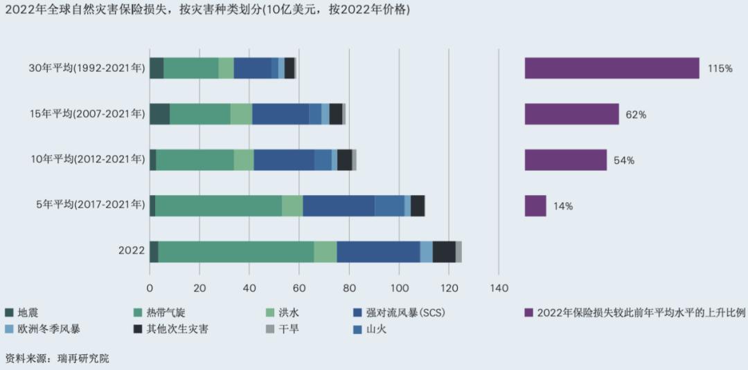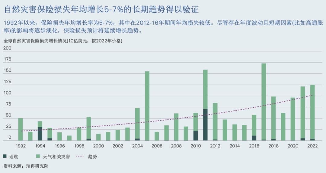 据瑞士再保险报告数据显示,2022年,自然灾害给全球经济带来了2750亿美元的损失,其中约45%有保险保障。2022年的保险损失结果再次印证了巨灾损失年均增长5%至7%的长期趋势。