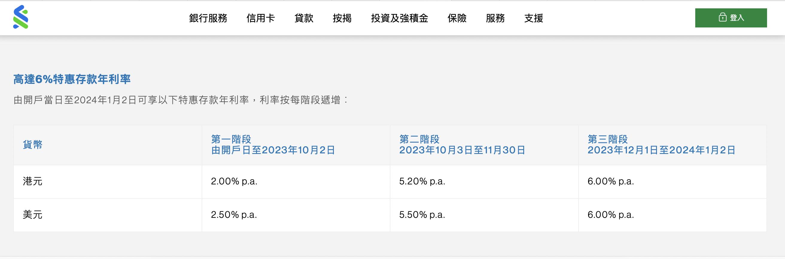 短期高息有渣打银行面向跨境理财通客户的9%美金定存(1 月计息),以及阶梯状以2%开始、最后阶段年化利率可达6%的“高息马拉松活期存款”。具体来看,利率按每阶段递增,港元存款第一阶段(开户日至10月2日)利率为2%,随后的第二阶段(10月3日至11月30日)、第三阶段(2023年12月1日至2024年1月2日)利率分别为5.2%和6%。同时,美元存款三个阶段利率则分别为 2.5%、5.5%、6%。