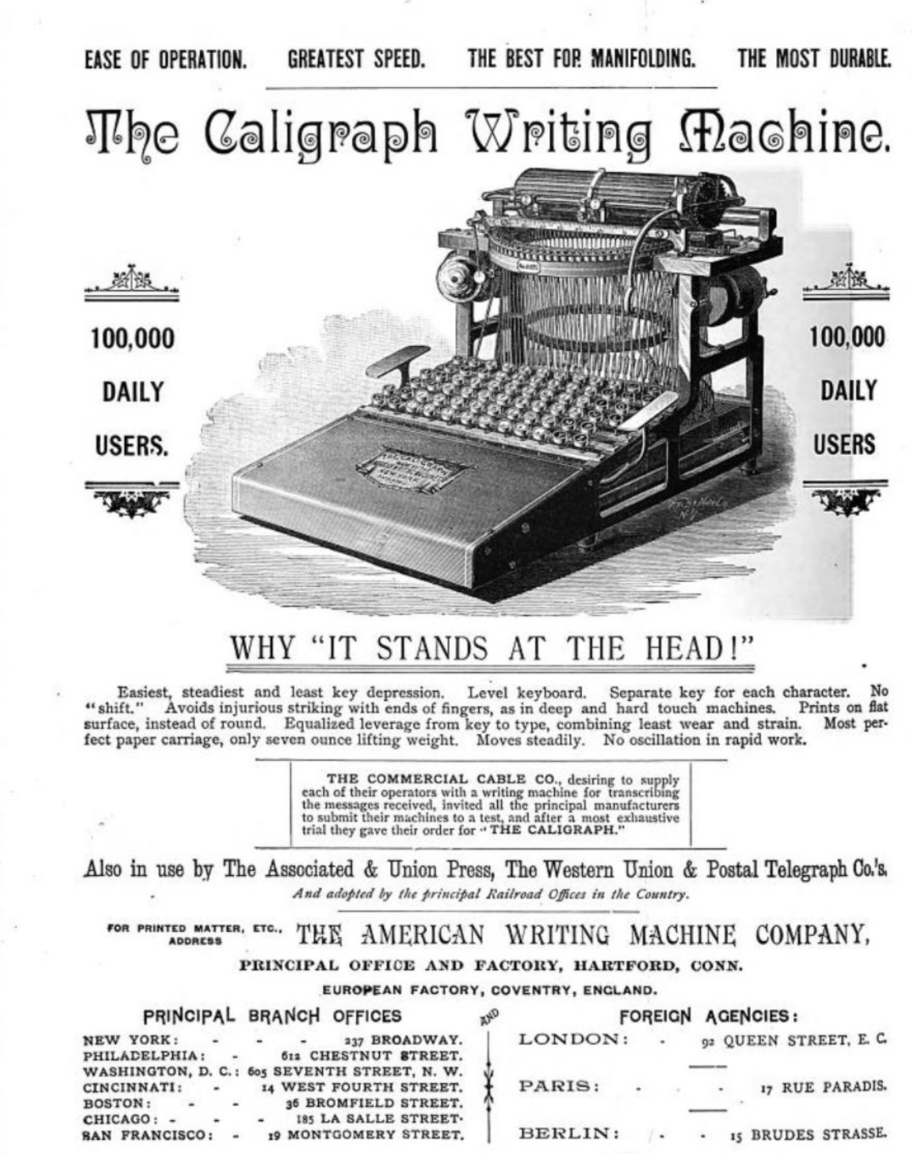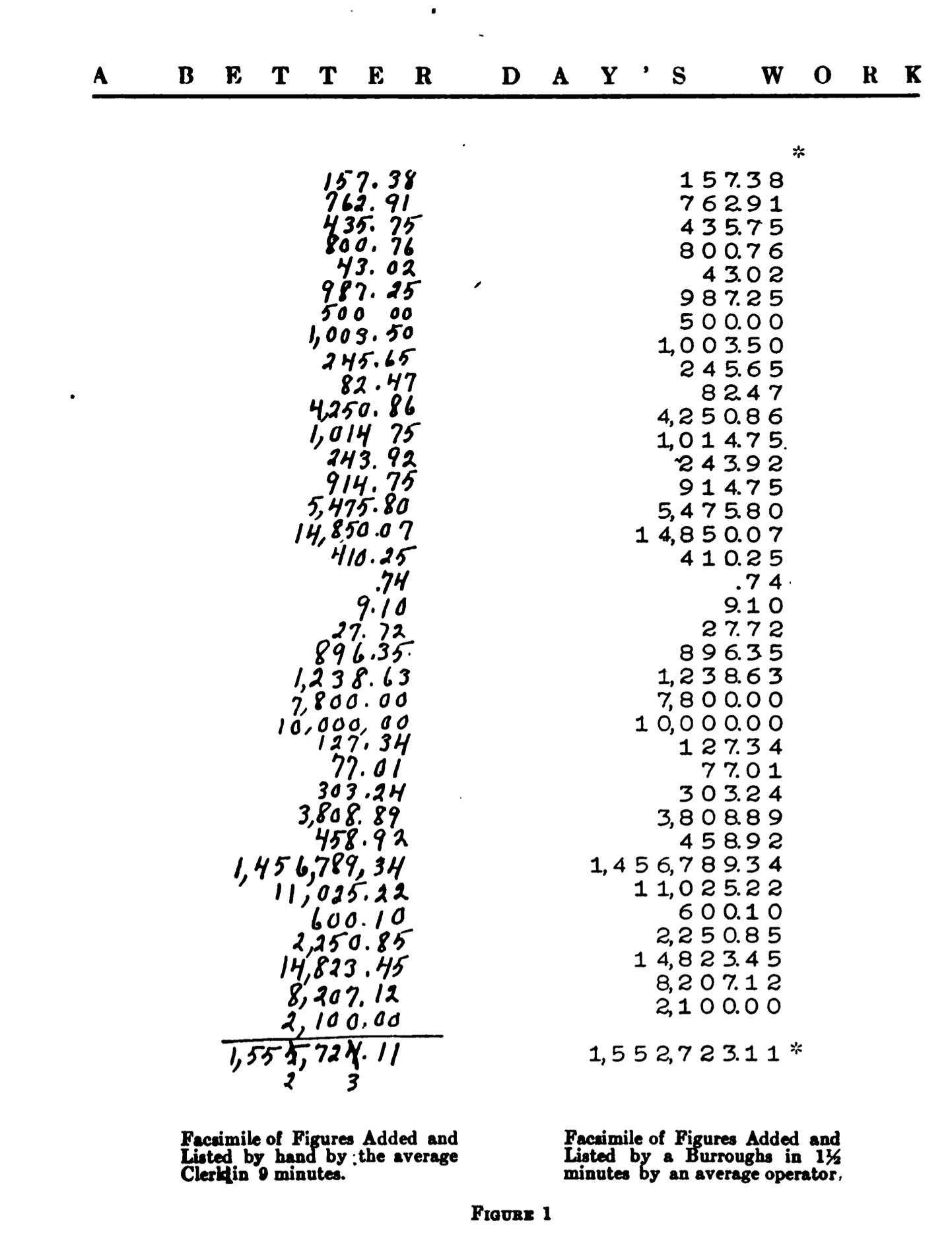 还不存在的未来工作很难想象,但过去的部分工作已经被自动化所取代也很难想象。 在果戈里的笔下,1830 年代被剥削的职员整个职业生涯都消耗在复印文件上,一次一份,全靠手工。他们就是人类复印机。到了 1880 年代,打字机已经可以以每分钟两倍字数的速度打印出清晰易读的文本,而复写机也能提供六份免费副本了。打字机意味着一名职员的产出量可以提高 10 倍以上。几十年后,像 Burroughs 这样的公司制造的加法机对簿记和会计也做了同样的事情:你再也不用拿起笔进行累加了,而是用机器完成,时间只需要过去的20%,而且还不会出错。