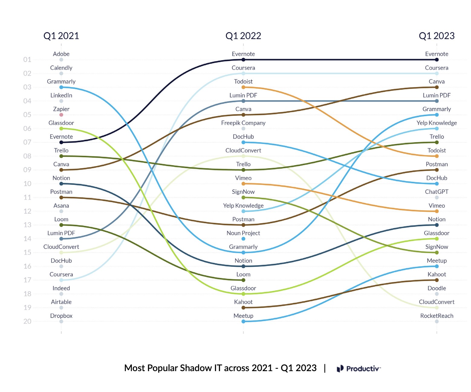 这种情况的进展速度也非常快:仅仅六个月后,ChatGPT 就拥有了(显然) 1 亿以上的用户,而来自Productiv的数据表明,它已经是排名前十的“影子 IT” app(编者按:指的是没有经过正式批准就被员工使用的app)。那么,这会夺走多少工作岗位,速度有多快,是否会有新的工作岗位来取代它们?