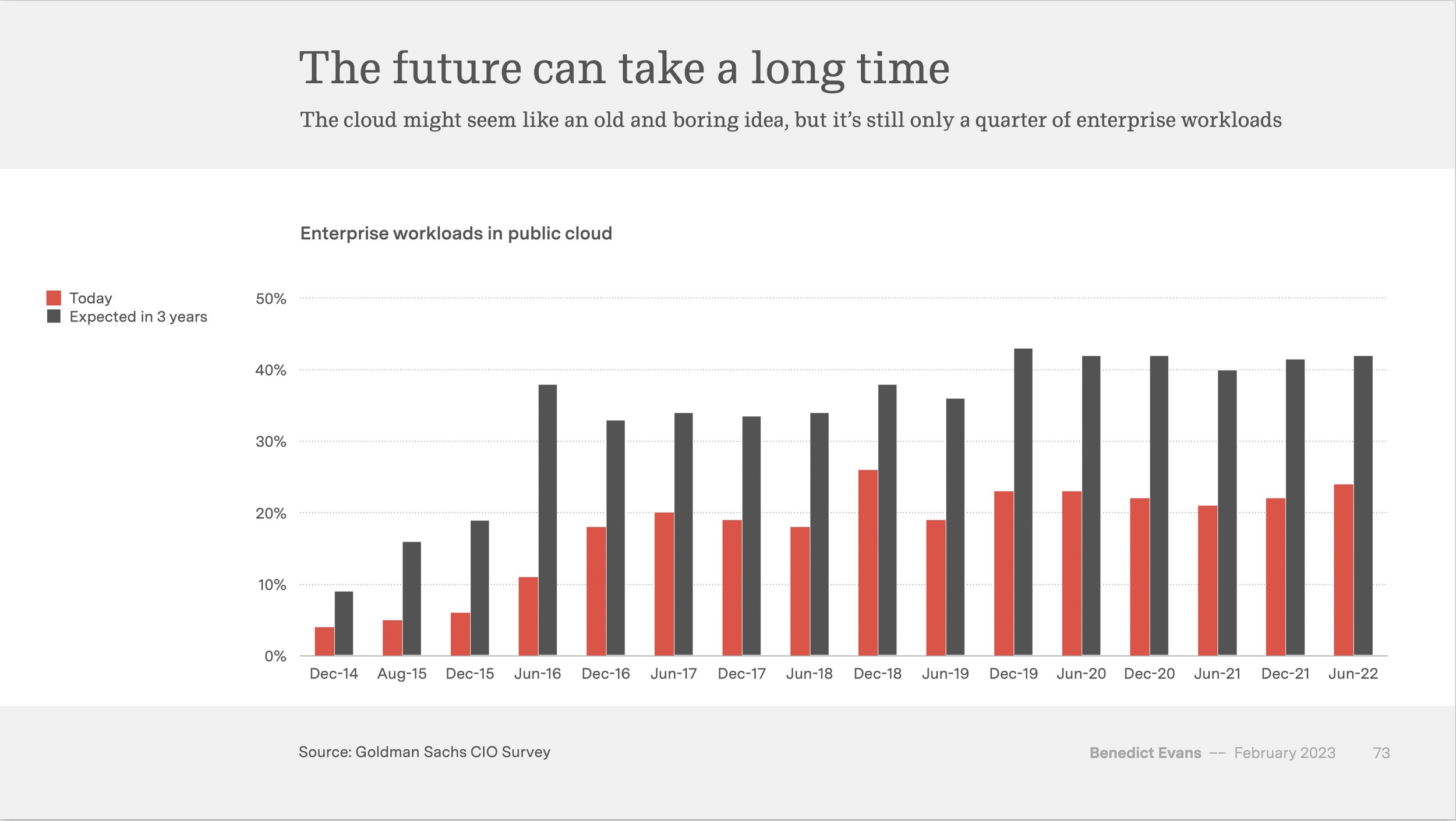 与此同时,购买管理大型复杂事物的工具也需要时间,哪怕这种工具已经开发出来并找到了产品市场匹配。要想做企业软件初创企业,面临的最基本挑战之一是初创公司的融资周期为18 个月,而许多企业的决策周期就要 18 个月。 SaaS本身加速了这格周期,因为你不需要进入企业数据中心的部署计划,但你还是得购买、集成和培训,而对于拥有数百万客户以及数万或数十万员工的公司来说,不要一下子就做出改变是有充分理由的。到达未来需要一段时间,硅谷以外的世界很复杂。