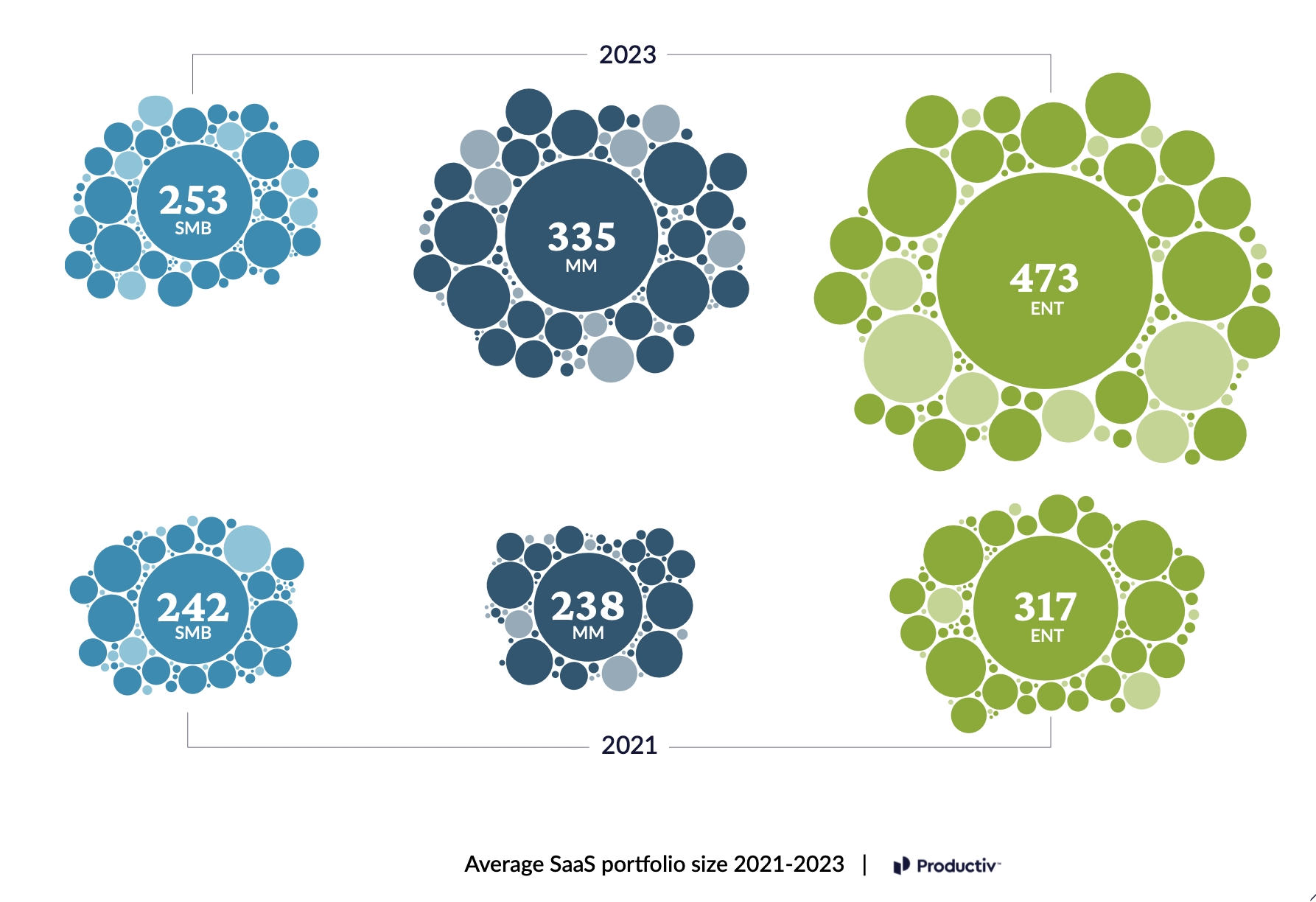如果你再思考一下来自Productiv和 Okta(了用不同方法)的这些图表的意味时,你的预期可能会有所不同。他们这两家公司报告称,其典型客户现在拥有数百种不同的软件应用,而企业客户拥有的软件数量则有近 500 种。