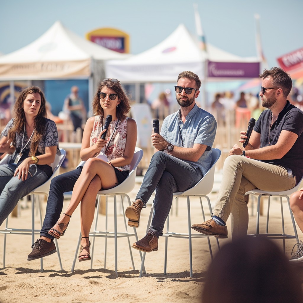 这张图是我用MidJourney生成的,换你来也能得出类似的内容。提示词是“戛纳国际创意节,海滩边,广告从业人员在研讨会台上讨论创意的照片。”