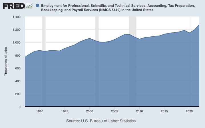 美国1990-2020年间会计、簿记、工资服务、纳税服务相关岗位情况