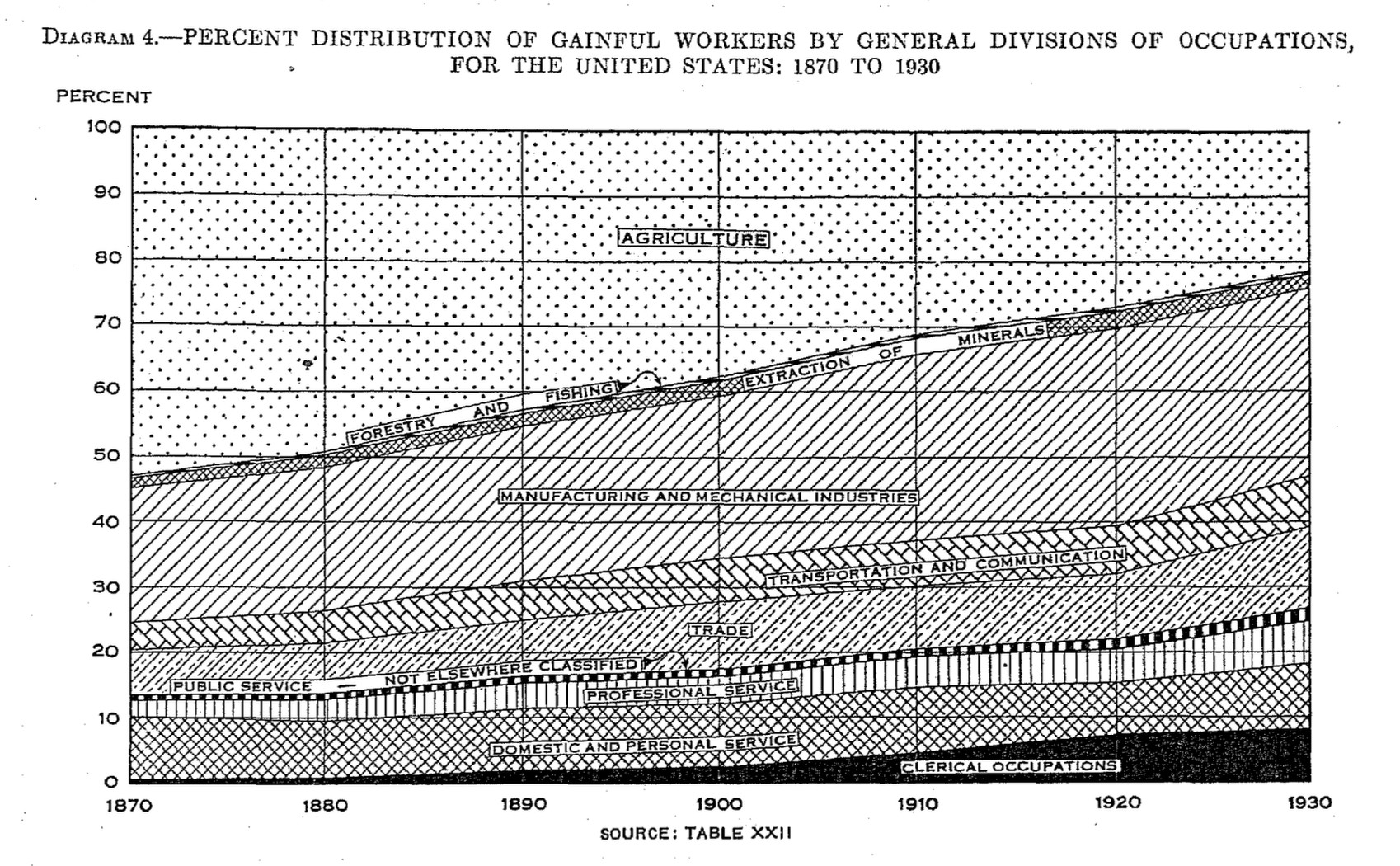 当这种情况发生在你们这一代人身上时,人们自然而然地会担心这一次不会再有新的工作岗位出现。我们可以看到一些工作岗位正在消失,但我们无法预测新的工作岗位会是什么,而且通常它们还不存在。根据经验,我们知道(或应该知道),过去总会有新工作出现,而且这些工作也是不可预测的:1800 年的时候,没人会预测到 1900 年有一百万美国人从事“铁路”工作, 1900 年的时候,没人会预见到“视频后期制作”或“软件工程师”会成为一个工作类别。但仅仅因为过去一直都这样,就相信这种情况现在还会发生似乎还不够。你怎么知道这次会延续之前的情况呢?这次会不一样吗?