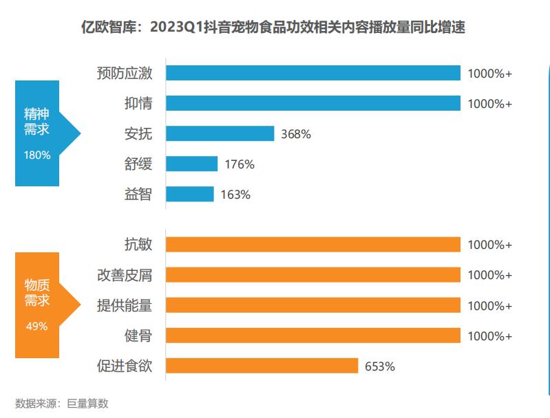 宠主对宠物需求的关注已从逐渐从物质层面拓展到精神层面,精神需求下的与宠物心理健康相关的产品及服务成为高潜力赛道。2023年Q1抖音 “心理健康”相关内容播放量同比增加高达180%,在所有宠物食品功效类内容中表现最佳。