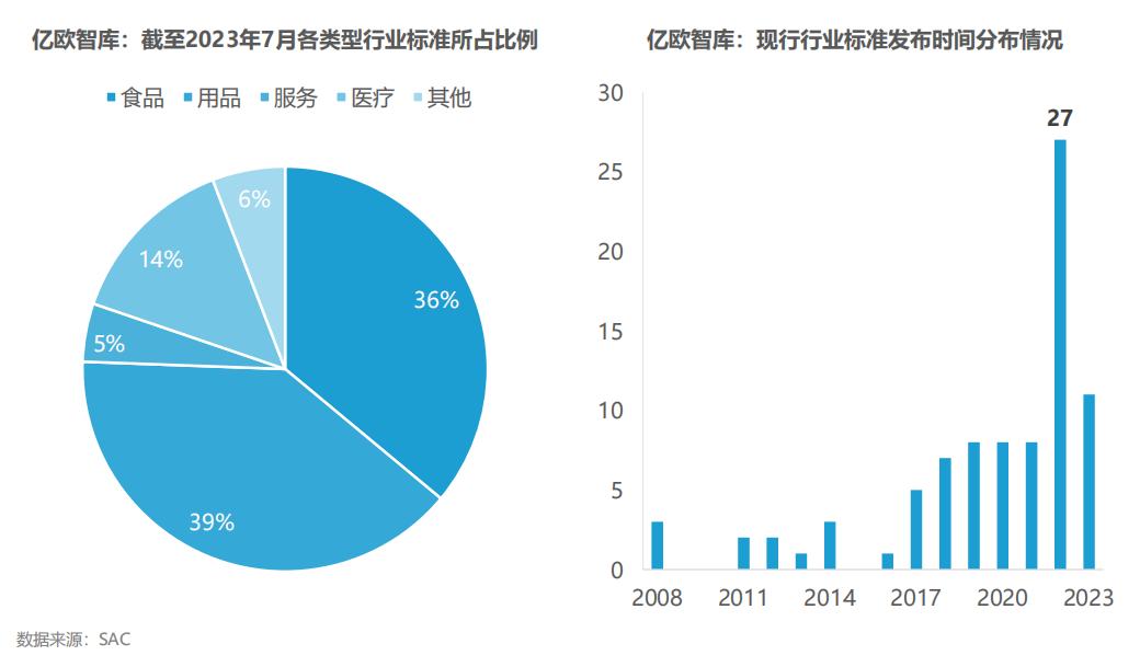 截至2023年7月,我国宠物行业现行国家标准5项,行业标准12项,地方标准9项,团体标准60项。整体来看,行业标准体系缺口较大,对行业长期长期规范性发展有一定影响。2022年起,行业标准爆发式增长,仅2022年一年就发布了27项标准,虽然其中绝大多数仍是团体标准层面,但 是已能看到行业发展逐渐走向规范的趋势。