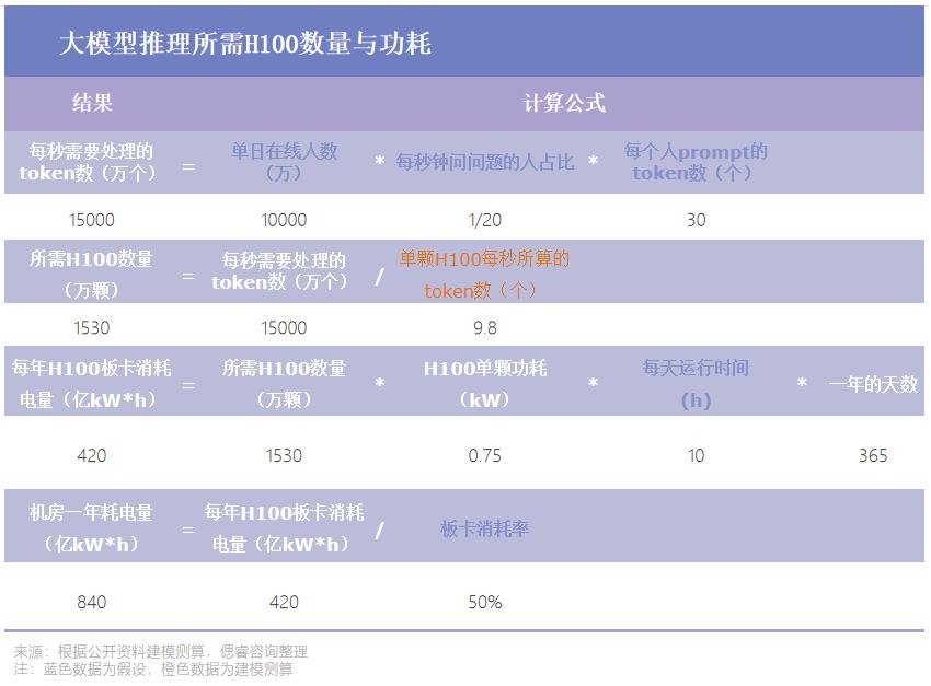 假设有1亿人同时在线,每日有5%的人每秒同时提问,每个prompt占30个token,便需要1530万颗H100芯片来提供其推理算力;而每颗H100的功耗在750W左右,若每天运行10个小时,这些H100芯片所在的数据中心一年的耗电量将达到840亿kW*h,而三峡大坝一年的发电量是882亿kW*h。