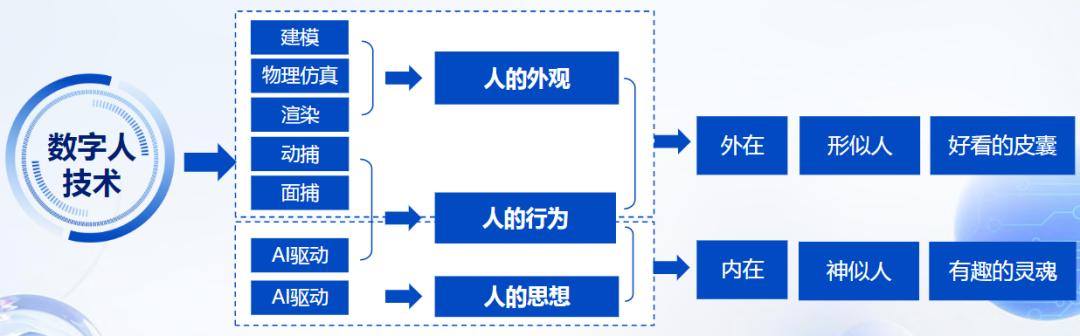业内人士,给了些tips:英伟达副总裁沈威认为,多模态交互和深度学习是数字人真正的灵魂。上海科技大学虞晶怡教授给出了更具体的说法:通过建模、渲染、动作捕捉和AI驱动等关键技术构成底层架构,能够让数字人的外貌更加精致、形象更加逼真,动作更加自然。