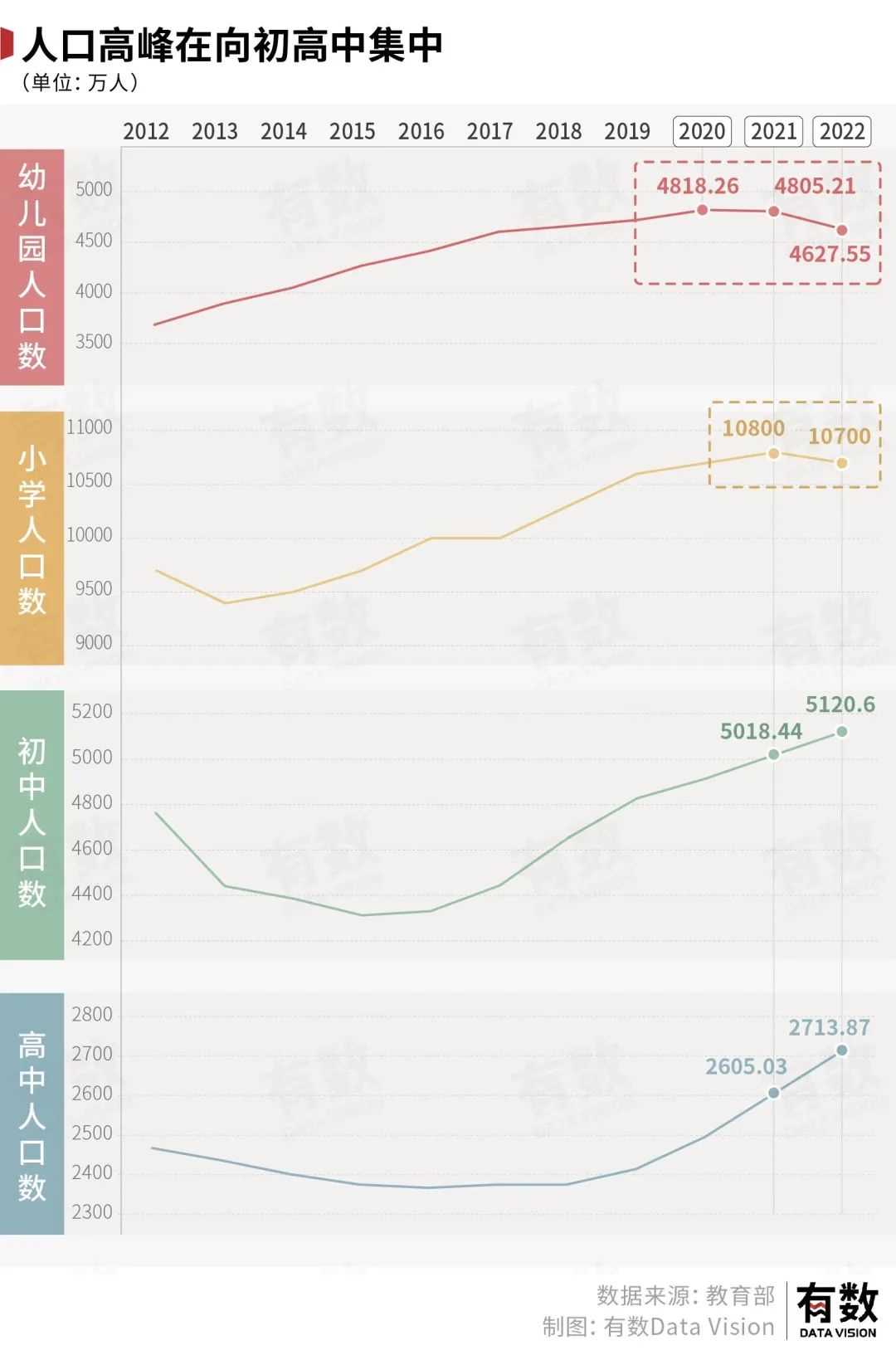 从幼儿园、小学、初中、高中的在校人数来看,当下初高中的在校人数仍在增长,也就是说,未来的三到六年参加高考的人数仍会继续突破峰值。