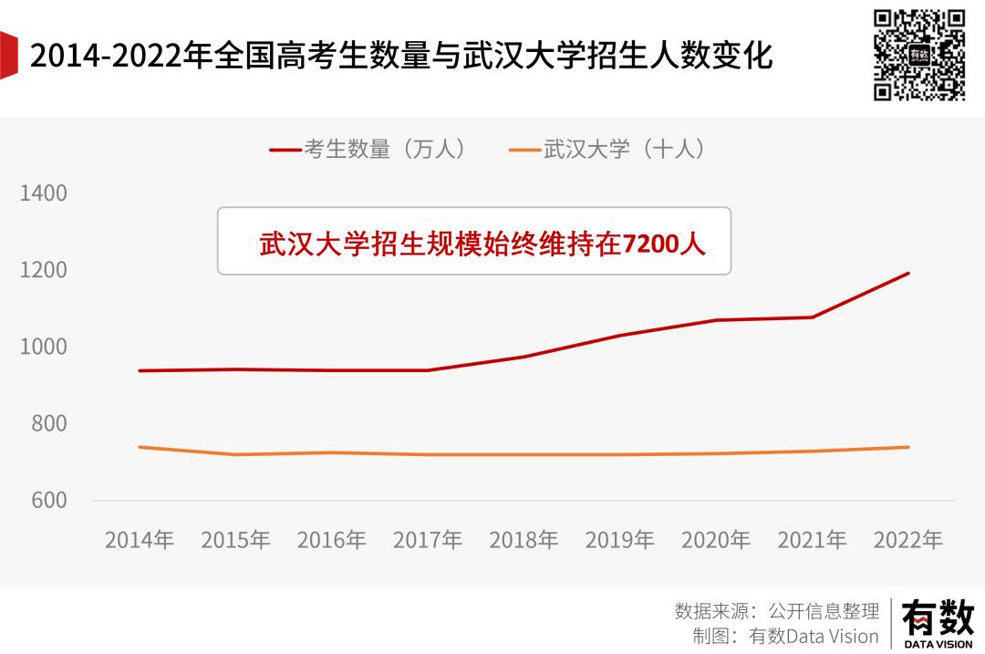 以历年数据均完全公开的武汉大学为例,考生规模动辄十万百万级的激增,但其招生人数变化幅度基本在十位数波动。