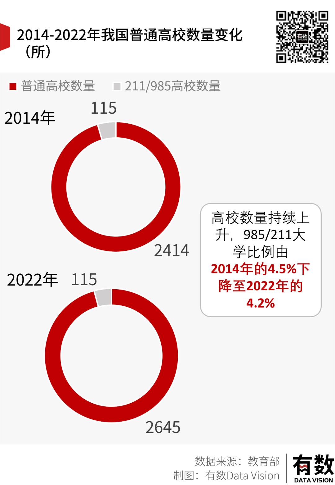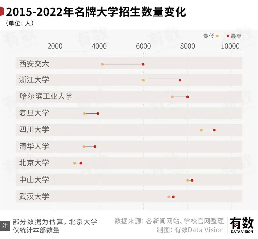 另一方面,不仅985/211院校的数量没有增长,其招生人数在过去几年也没有太大涨幅。其中,清华大学在2022年还少招了100人。