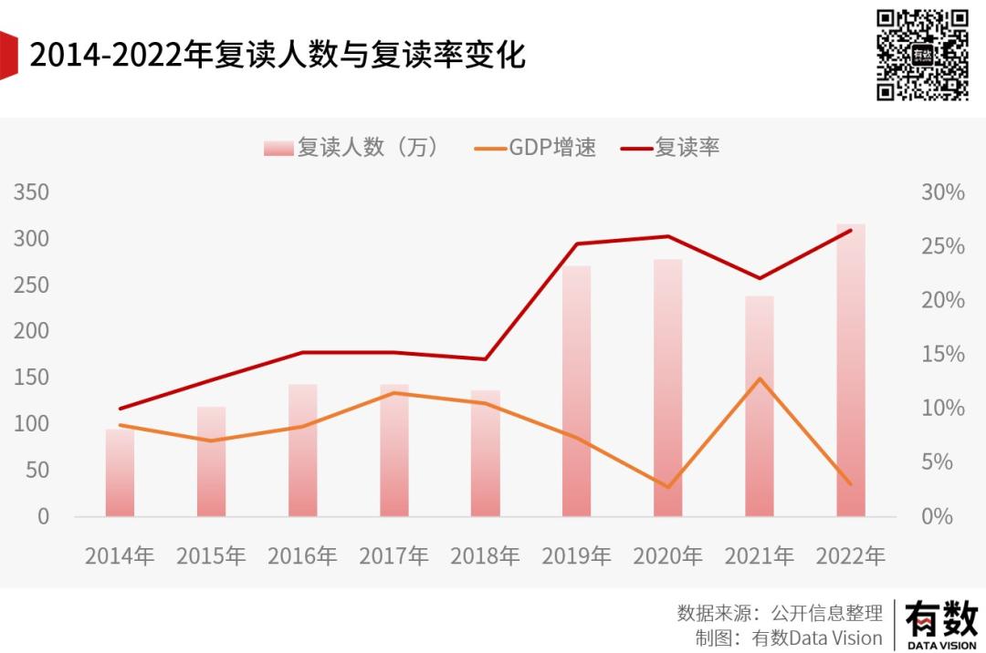 有意思的是,复读率和GDP增速有一个成反比的趋势,我们也不知道其中的原因。