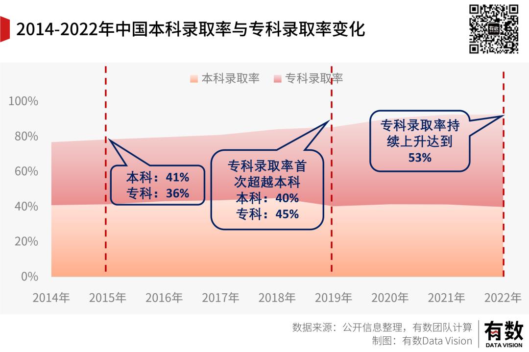 过去20年中,大专录取率从30%一路上升至53%,本科录取率在平稳增长多年后,反而过去几年出现了下滑的迹象。