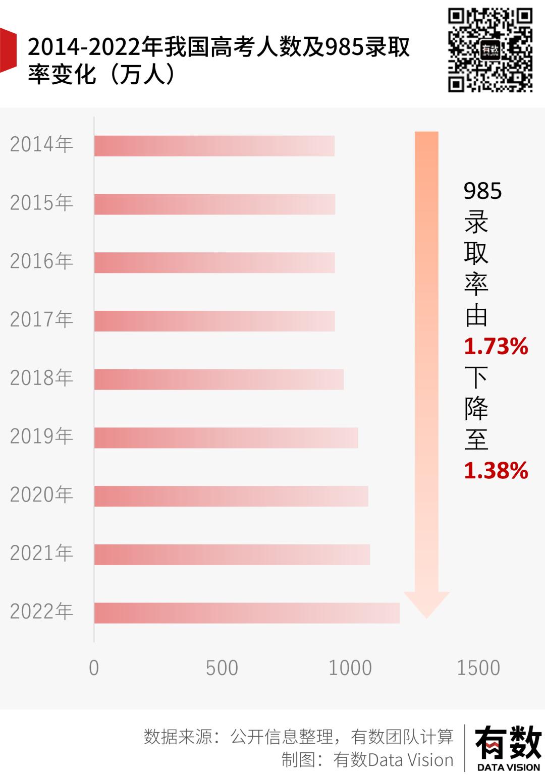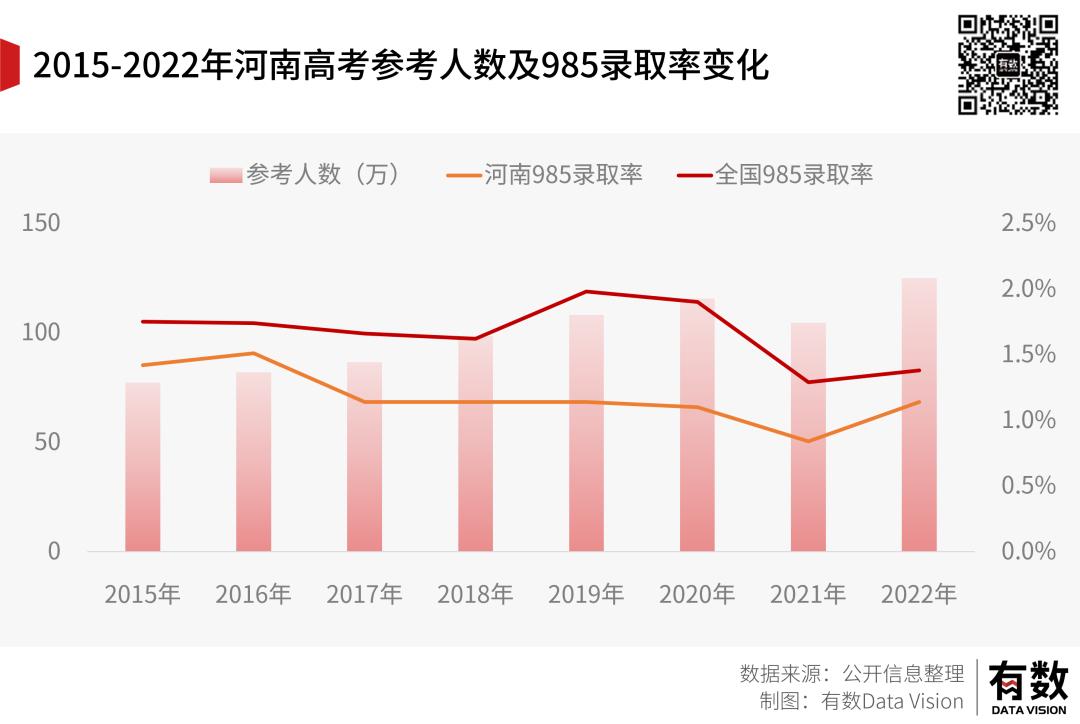竞争更加激烈的领域是985院校,伴随着高考人数增长,其录取率一路下滑至2022年的1.38%。虽然八年间只下滑了0.4%,但考虑到庞大的考生基数,也是一个不小的数字。