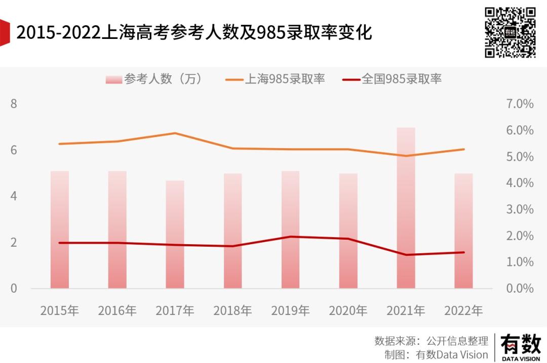 最典型的是上海,在春季高考、自主招生、出国等分流因素的影响下,历年参加高考的人数基本稳定在5万人上下,同时,因为上海本地985高校数量相对较多,因此历年985录取率均维持在高位。