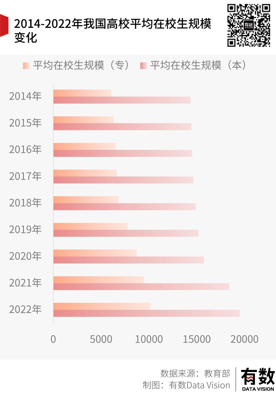 过去十年,中国高校总量从2409所,增长至2022年的2760所,同期平均每所本科学校学生数量,从13564人一路增长至19487人,大专更是接近翻倍。