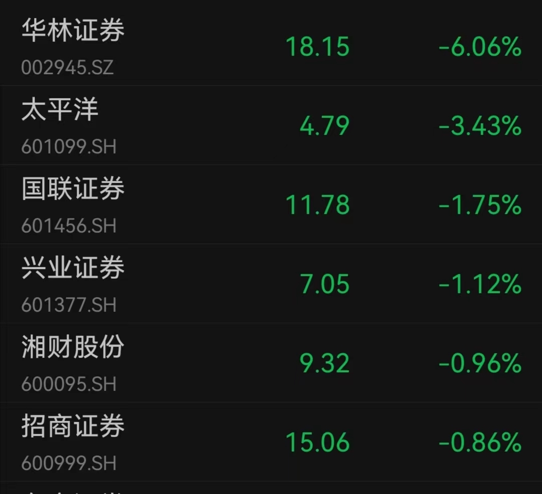 午后,券商股冲高回落,华林证券跌近8%,指南针、国联证券、太平洋、湘财股份、首创证券等跟跌。