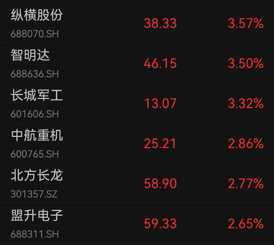 军工板块震荡走高,观想科技涨超8%,鸿远电子、华力创通、理工导航、中光防雷、长城军工等跟涨。