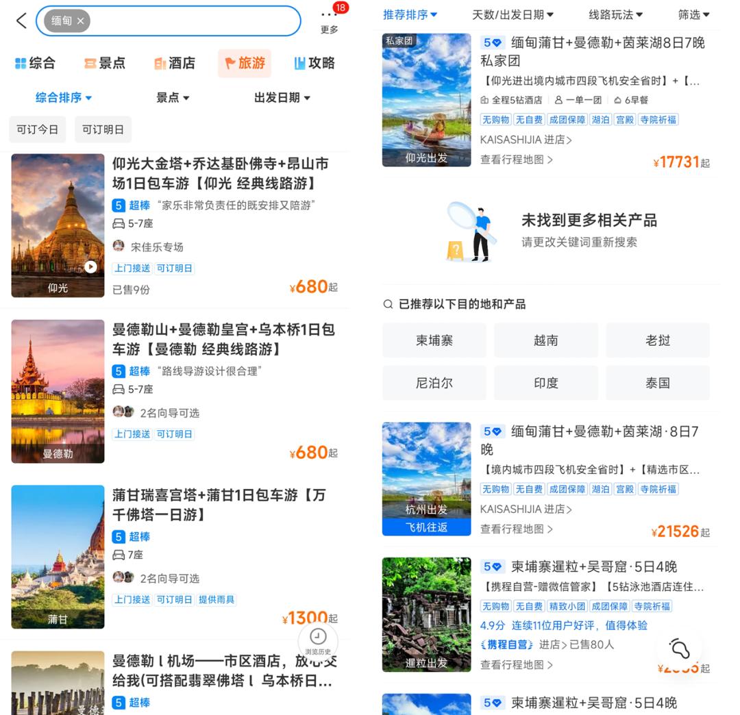 我们通过飞猪、携程等在线酒旅平台查询,发现目前以缅甸为目的地的跟团游项目很少,几乎“屈指可数”。有从业人士向我们解释,因为客源太少,缺乏性价比。