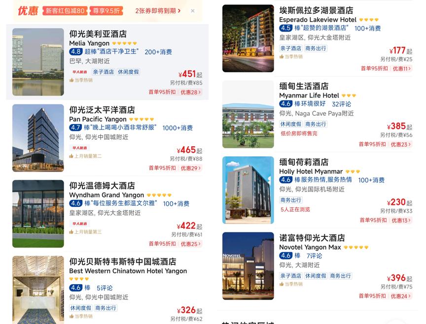 我们通过本地生活服务平台观察,仰光部分四星酒店,已跌至200元以下。余雨家族在仰光开办工厂,顺带经营了一家酒店,近期定价在200元左右一晚。“主要是来仰光做生意的中国人住,但也只有零星几个,游客完全没看到。”