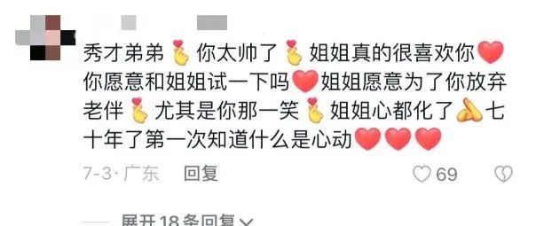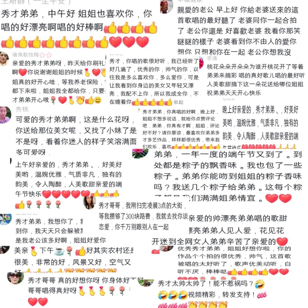 在秀才的短视频留言区,不仅有一日三次的问候,还有太多的表白,甚至有人比赛情诗,还有大妈提到“家人刚脱离了危险期,从icu病房出来,就第一时间来看秀才弟弟”。