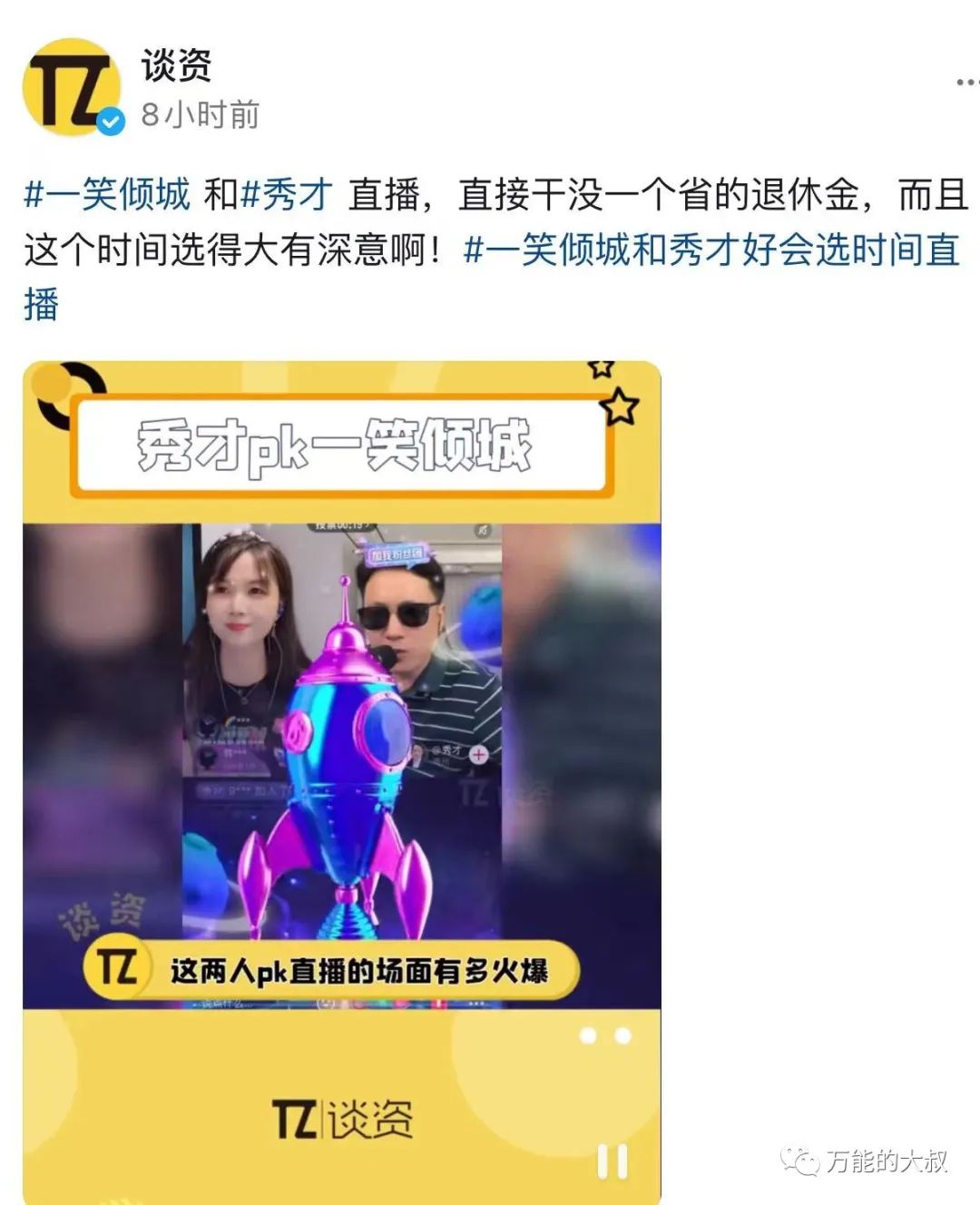 pk的两位网红呢,号称大爷和大妈圈的顶流网红——1800万粉丝的@一笑倾城 和1000万粉丝的@秀才。