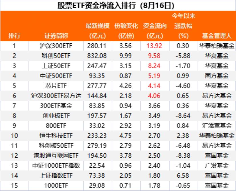 不过,与之盘中连日低迷相对应的是,8月的ETF市场炙手可热,显示出资金持续借道ETF布局权益市场的热情。 截至8月16日,在短短的12个交易日内,基金份额净增长约525.34亿份,资金净流入额约合811.78亿元。