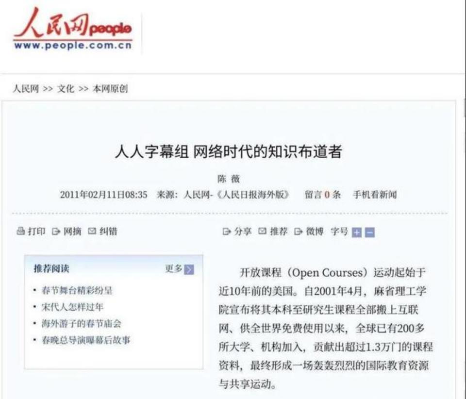 因此,在发展的初期,字幕组曾一度受到了官方的“认可”。例如2011年初,人民网转发了《中国新闻周刊》的一篇名为《人人字幕组 网络时代的知识布道者》的报道,肯定了人人字幕组为教育资源分享与传播做出的贡献。