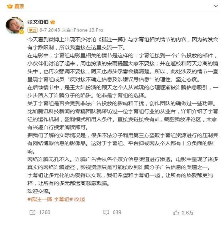 据他所说,字幕组解散的原因是《孤注一掷》“污名化”字幕组:“作为编剧和导演,没有仔细调查和了解字幕组,只凭想当然把菠菜(指博彩)和DB(指赌博)这种事扣到字幕组身上,票房很好,又怎样?不符合真实事实,就是瞎编想当然。”