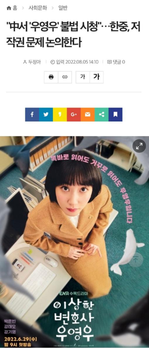 在2022年中韩版权研讨会上,韩方以韩剧《奇怪的律师禹英雨》为例,要求中国版权管理局协助,以应对韩国内容被侵犯著作权的问题。