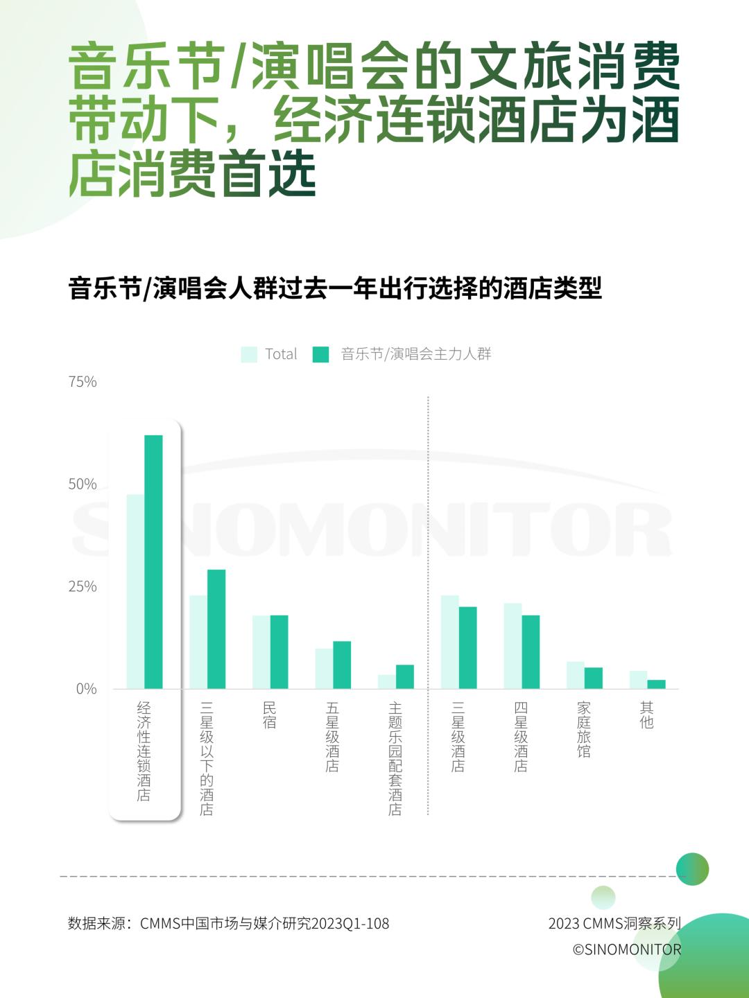 通过CMMS数据发现,喜欢音乐节人群,超过六成是年轻人且多为中等收入,他们更喜欢流行时尚,更敢于花钱用于休闲活动,在酒店偏好上以经济性连锁酒店及三星级以下为主。