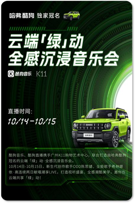 2022年10月14和15日,酷狗音乐、酷狗直播与广州K11购物艺术中心联合打造,由哈弗酷狗独家冠名的“云端「绿」动”全感沉浸音乐会。