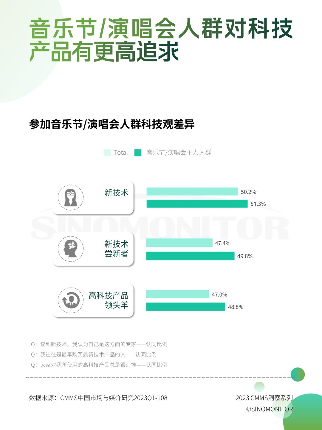 从科技观上看,参加音乐节演唱会人群对于新兴技术有着更高的追求,相比总人群他们愿意去了解、尝试和钻研。