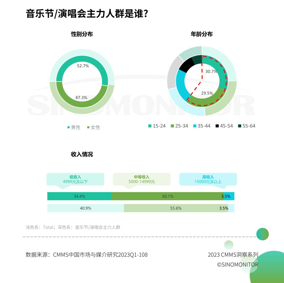 年轻人是音乐节/演唱会的主力人群,15-34岁人群占比超60%,男性占比略高于女性,中等收入人群占比超60%。