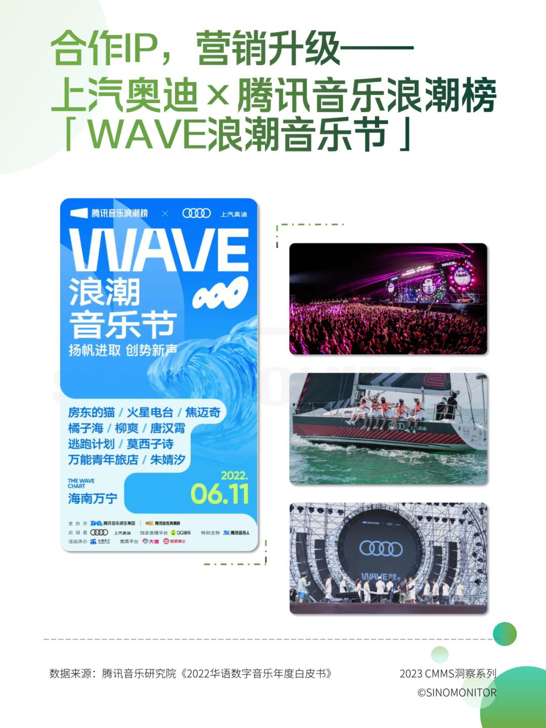 ②营销方法亮点:上汽奥迪将车主的线下帆船体验活动,以及和腾讯音乐浪潮榜合作的「WAVE浪湖音乐节」等一系列活动整合为了「盛夏宠粉季」,通过帆船「乘风破浪」的精神,以及浪潮音乐节潮流的音乐内容,多方位传递了自己的品牌精神。而在音乐营销的部分,在线下演出前,还合作演出艺人唐汉霄,为品牌定制了活动主题曲《为梦而生》,并上线了涵盖演出阵容的品牌歌单,线下演出结束后,又在QQ音乐进行了线上复播。通过「组合拳」的方式,延长、放大了营销价值。