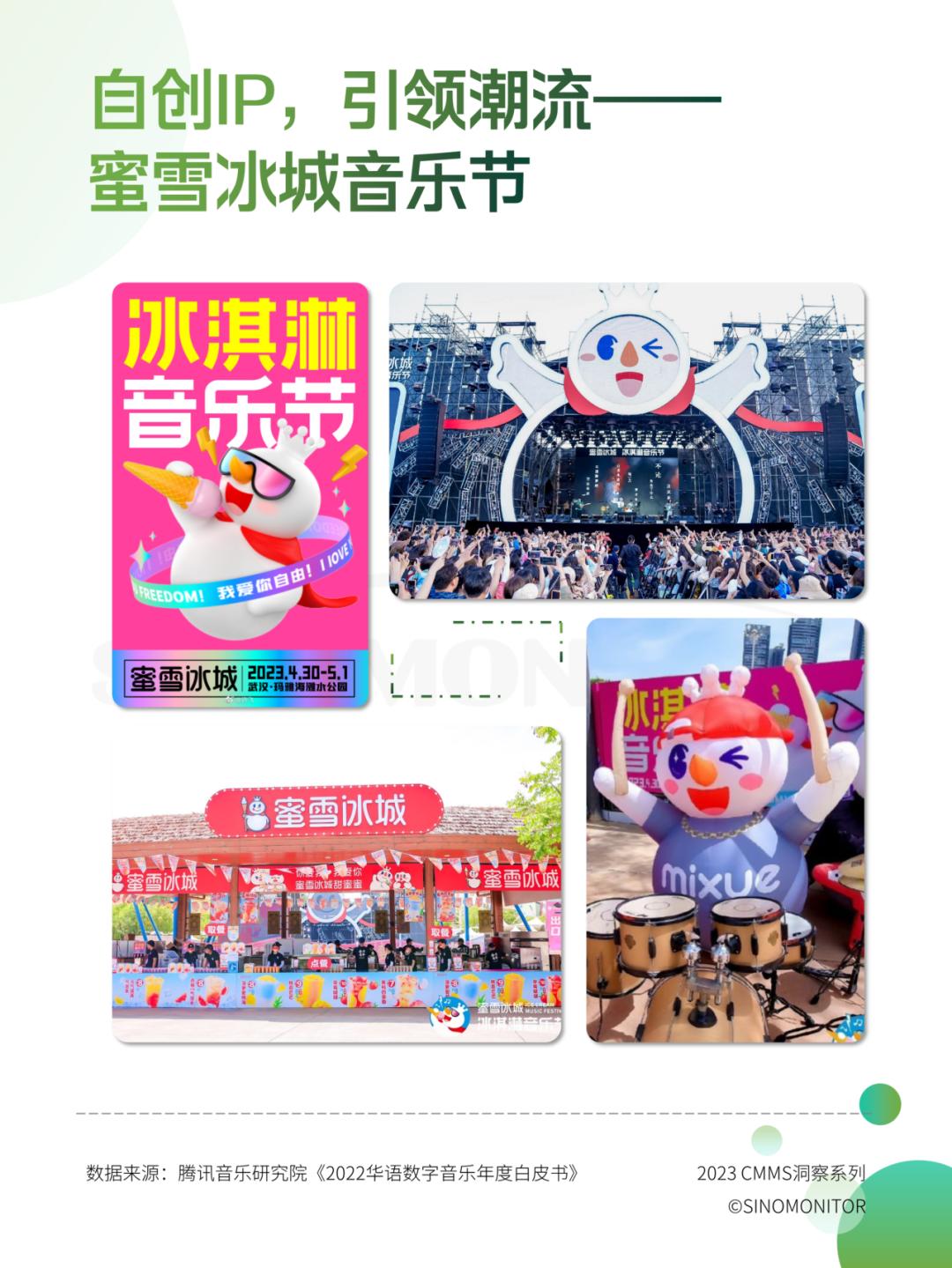 ②营销方法亮点:一、票价不设早鸟、预售和正式票之分,也没有划分VIP区和普通区,全场均为199元)天。在音乐节高票价被持续讨论的背景下,突出了自身的「平价」特性;二、现场大量「蜜雪元素」的植入,不仅包括8米高的雪王气模、雪王形象的舞台设计、现场30+冰淇淋快闪店,雪王人偶更是在场下蹦迪、上台打鼓,给现场观众留下了极为深刻的印象。