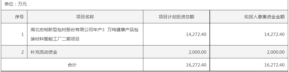 根据招股书显示,本次公司拟募资1.63亿元,资金将用于湖北宏裕新型包材股份有限公司年产3万吨健康产品包装材料智能工厂二期项目和补充流动资金等。项目建成达产后,将进一步缓解公司的产能瓶颈,拓展公司业务范围,增强公司的盈利能力。