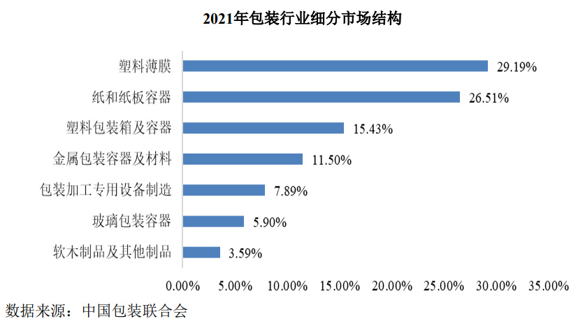 从细分行业来看,塑料薄膜包装占比最大。根据中国包装联合会公布的统计数据,2021年塑料薄膜行业规模以上企业主营业务收入总和为3514.68亿元,占整个包装行业的29.19%。
