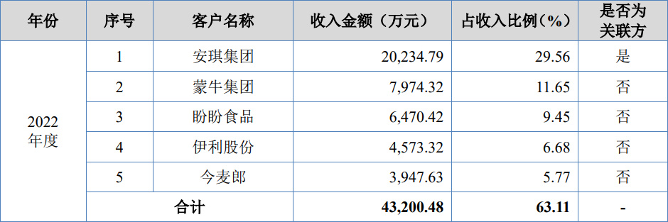 客户方面,公司客户以食品企业为主。2022年公司前五大销售客户分别是安琪集团、蒙牛集团、盼盼食品、伊利股份、今麦郎。