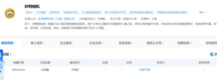 对于资金方面,天眼查数据显示,妙鸭背后主体为未序网络科技(上海)有限公司,于今年3月获得阿里大文娱一笔天使轮融资。