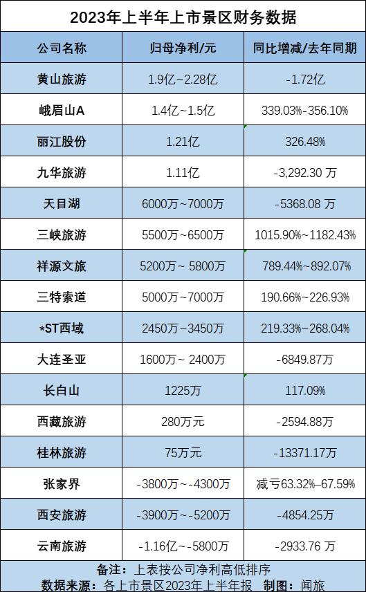 其中超亿元的有4家,分别为黄山旅游、峨眉山A、丽江股份、九华旅游。在这当中,净利最高的为黄山旅游,其2023年上半年预计实现净利润1.9亿~2.28亿元,较比去年同期的亏损1.72亿元出现大幅增长。