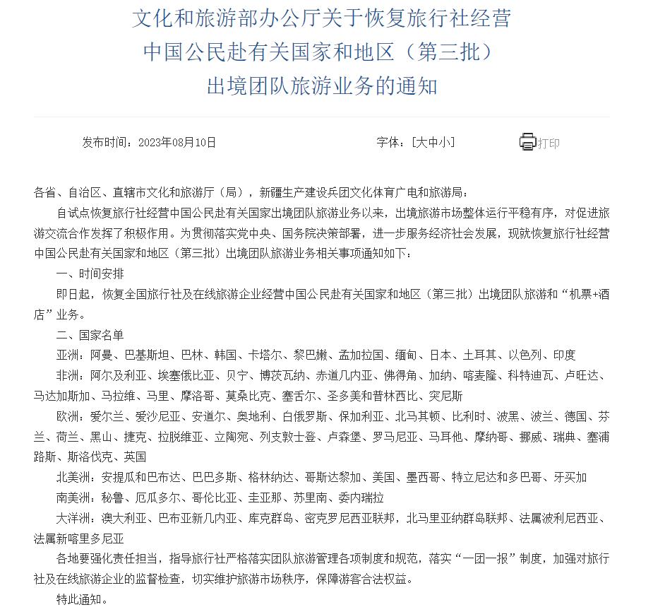 一方面,暑期出行人数再创高峰,另一方面,相关政策也在下半年相继到来。8月10日,文化和旅游部官网发布《关于恢复旅行社经营中国公民赴有关国家和地区(第三批)出境团队旅游业务的通知》。通知中明确,自即日起,恢复全国旅行社及在线旅游企业经营中国公民赴有关国家和地区(第三批)出境团队旅游和“机票+酒店”业务。自此,恢复出境团队旅游国家名单总数已经扩充至138个。