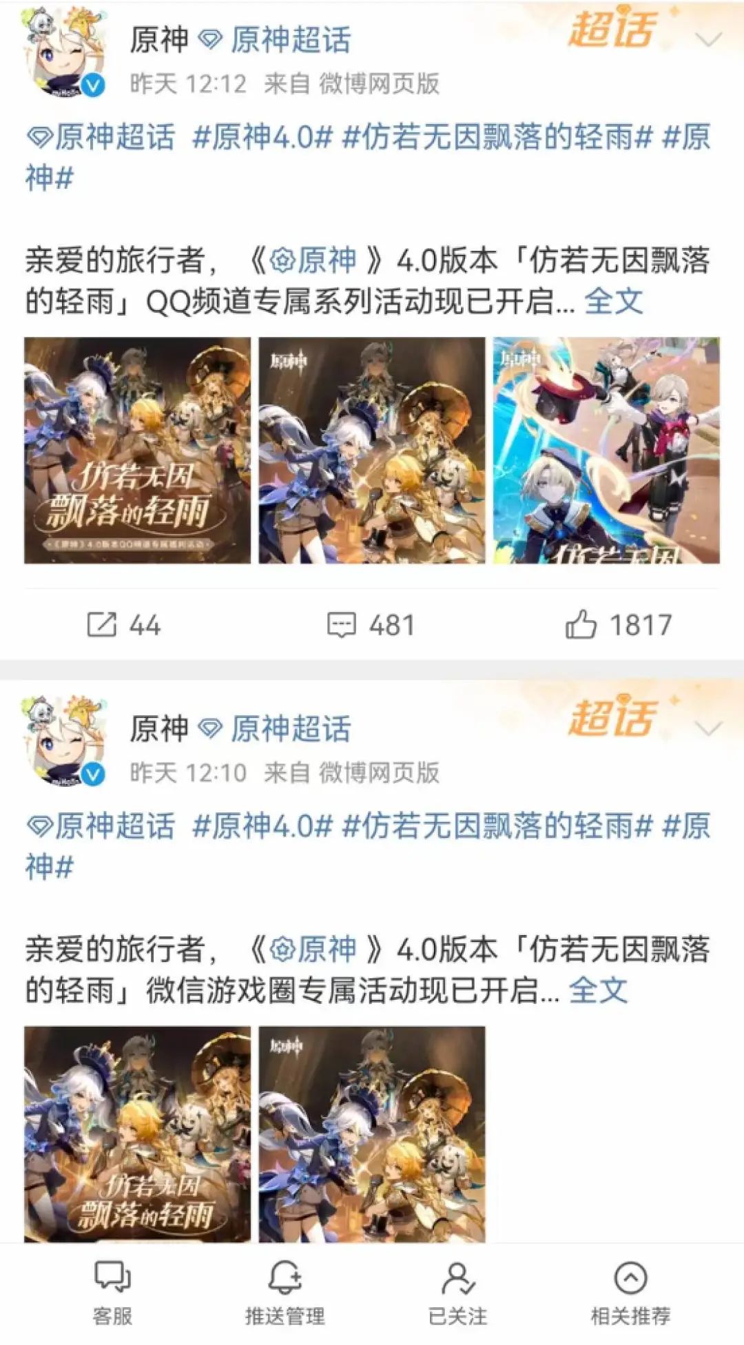 为了进一步扩大用户面,从今年开始,《原神》和微信游戏圈、QQ频道的专属活动也成为了版本更新标配,抖音上《原神》的热度也是居高不下,只要你是关注过《原神》的玩家,几乎在每个社交平台上都能见到《原神》版本上新的消息。