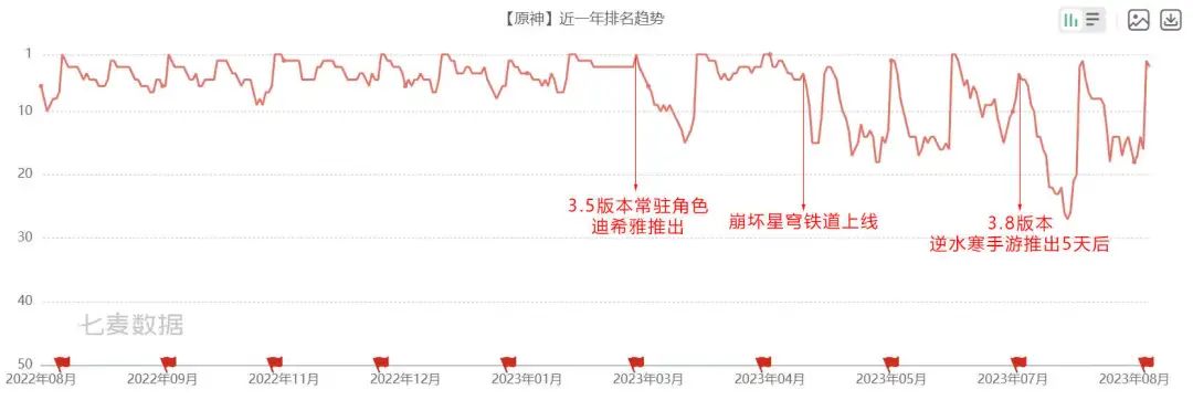 第三次下滑的节点则是3.8版本复刻可莉和优菈两个1.0版本角色,畅销榜排名一度跌至27名。此外,《逆水寒》手游的上线或也吸引了一部分《原神》的玩家。